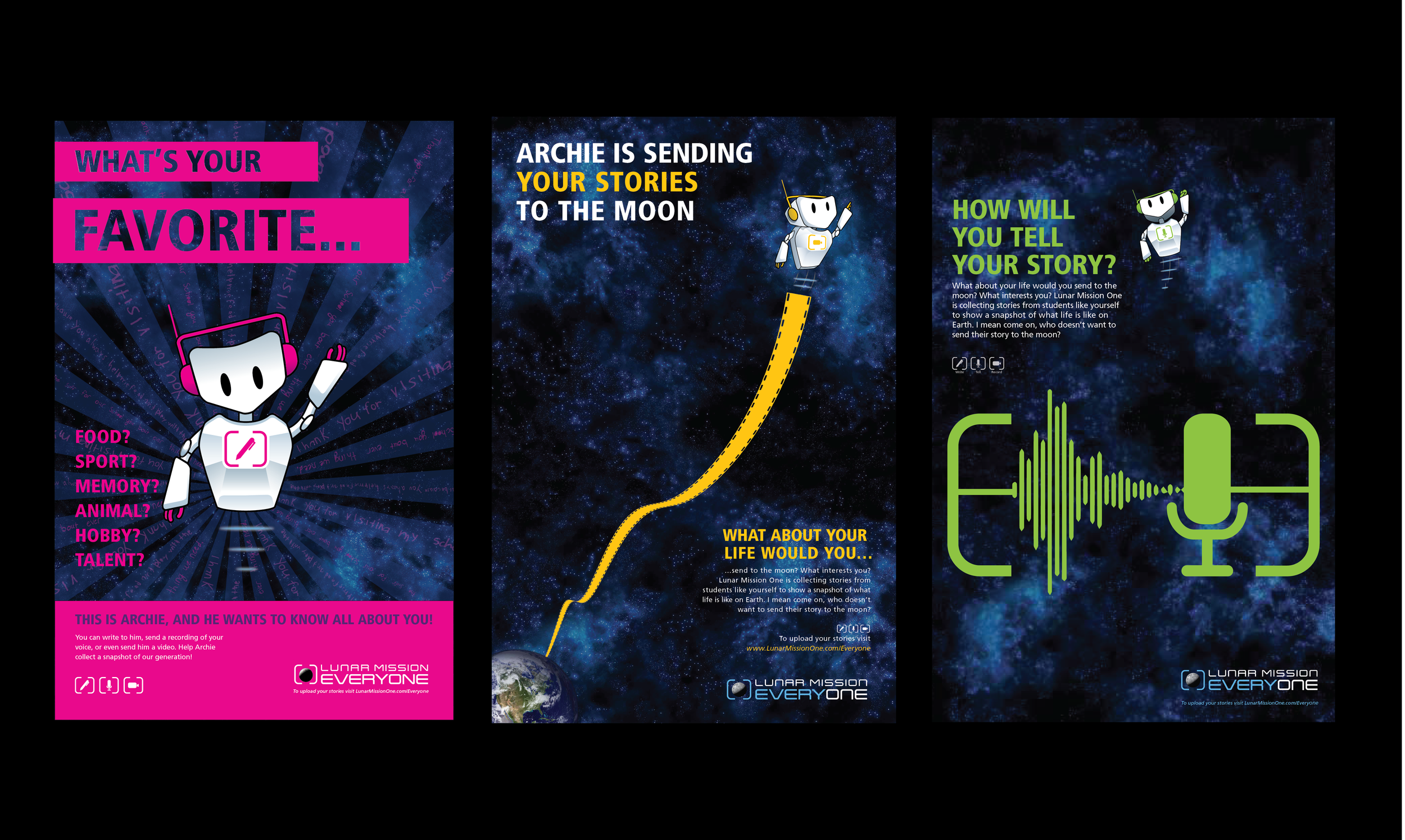 Lunar Mission One is a crowd-funded project to collect stories from around the world and send stories on a ship to the moon. The stories are to be left on the moon for future generations to learn about the world today. Lunar Mission One needed a new brand mark and a launch kit, including unique mailers, posters for all ages, and a mascot that would inspire and excite people to participate. The brand mark started by creating the word Lunar out of the viewfinder shape, which produced this sleek and contemporary logotype for Lunar Mission One. Archie the Archive is the robot mascot that figuratively takes the stories to the moon.